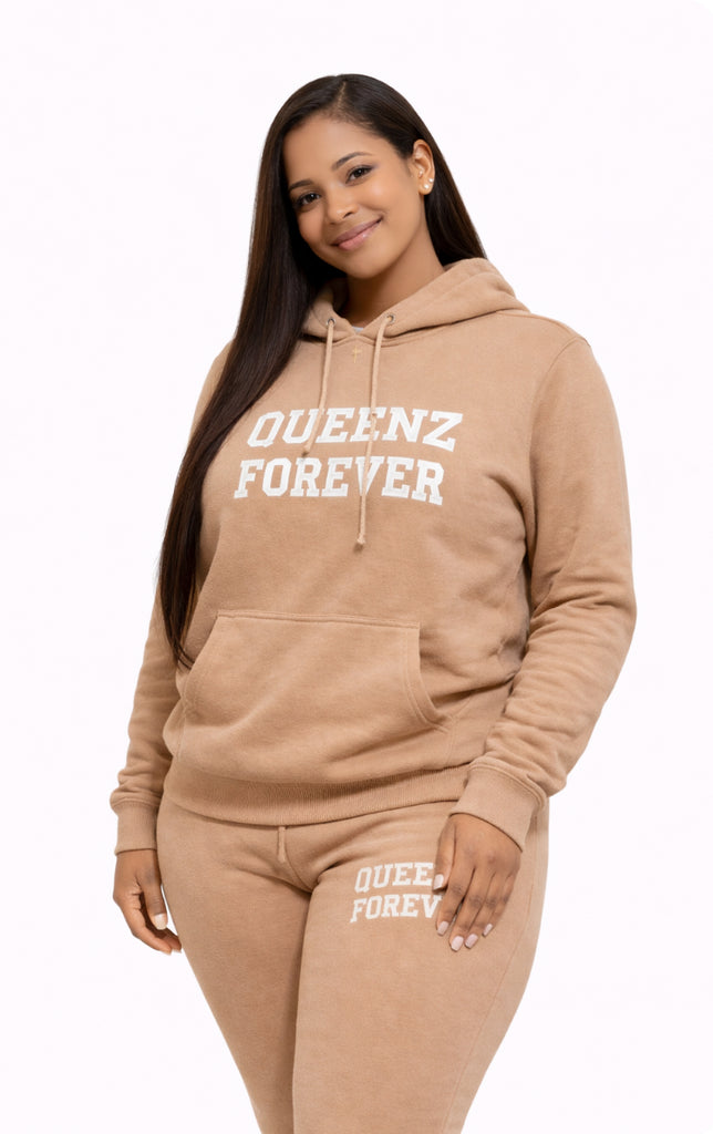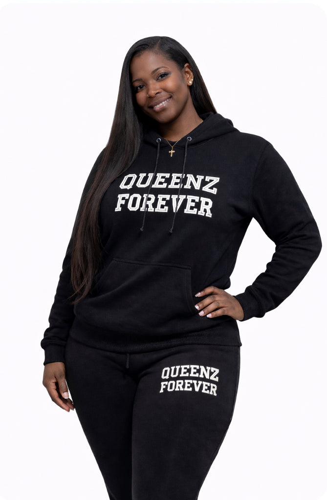 The hoodie features the iconic QUEENZ FOREVER logo across the chest in a crisp white finish, symbolizing strength, self-love, and timeless style. The matching joggers are designed to complement the look, creating a sleek, coordinated set that moves with you.
