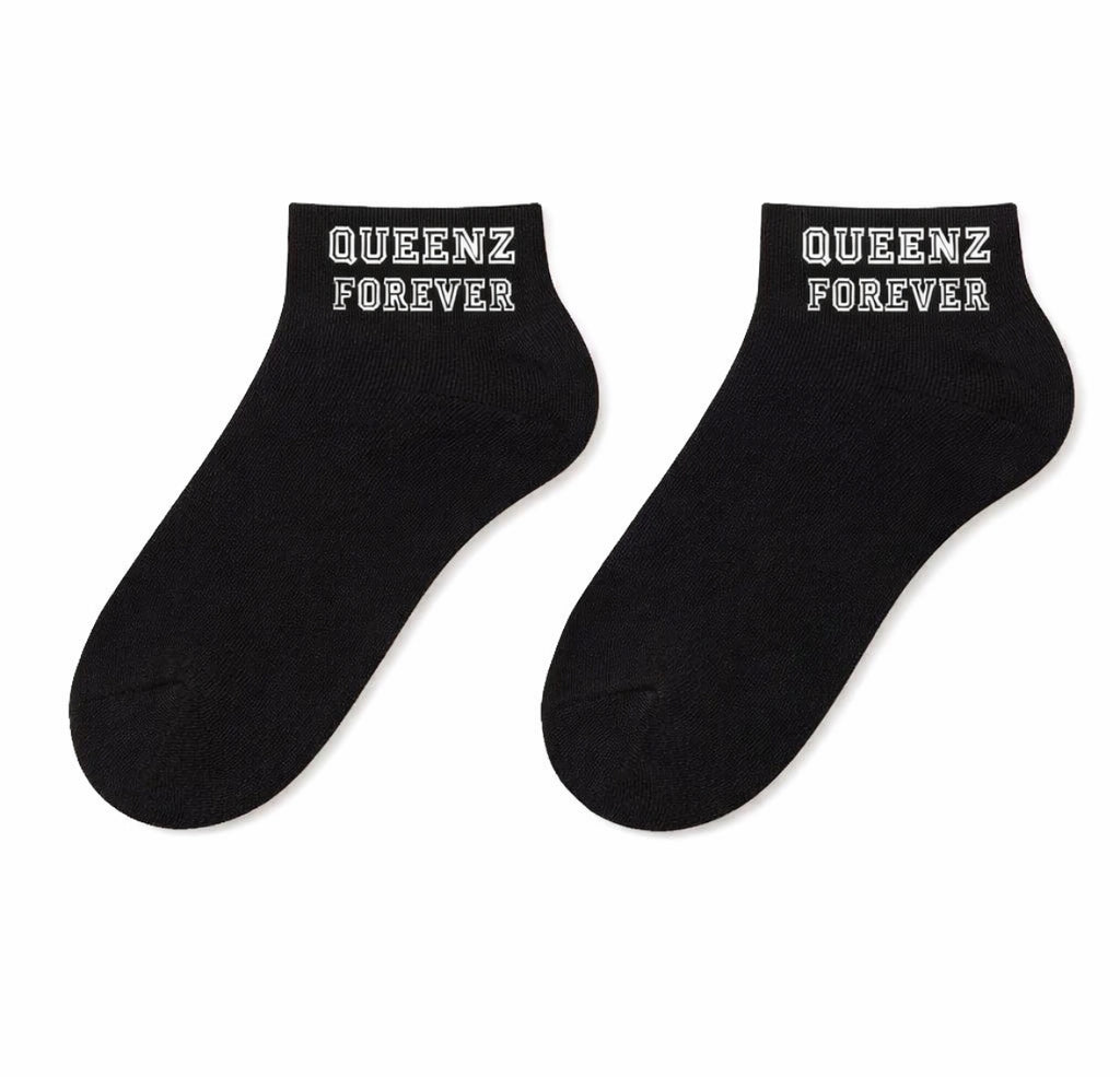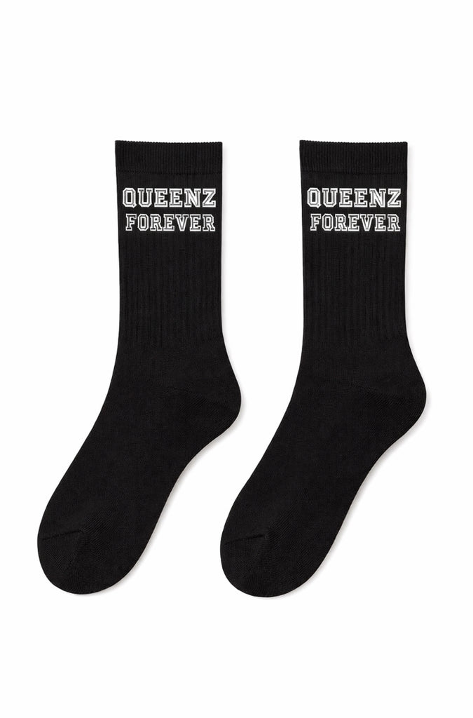 QUEENZ FOREVER Classic Signature Socks are designed to elevate your everyday look while keeping comfort front and center. Crafted in a classic black ribbed knit, these socks feature bold white QUEENZ FOREVER lettering placed on the side for a sleek, street-ready finish. Perfectly balanced between sporty and stylish, they pair effortlessly with sneakers, lounge sets, or casual fits.