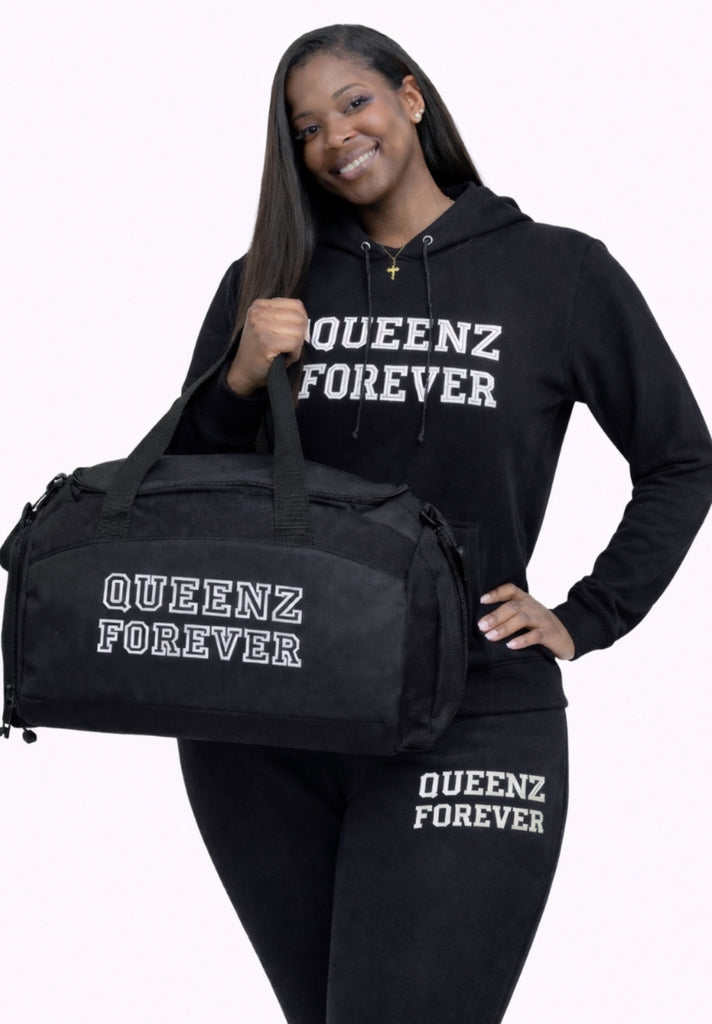 The soft jogger set features a relaxed hoodie and jogger pants with a flattering fit, finished with the signature QUEENZ FOREVER logo. Paired with the spacious duffle bag, this set blends fashion and function seamlessly.